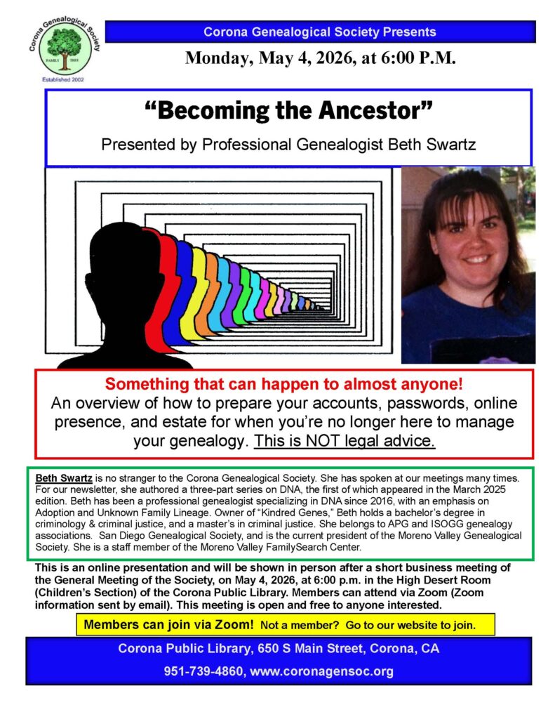 Beth is no stranger to the Corona Genealogical Society and applies her unique approaches to family history research to various family puzzles. Owner of “Kindred Genes,” Beth is a professional genealogist, specializing in DNA, since 2016, with an emphasis on Adoption and Unknown Family Lineage. She is also the author of a new article series on DNA, published over 3 issues of the Corona Genealogical Society newsletter (specially formatted for our society with the first to appear in the March 2025 edition). Beth holds a Bachelor’s degree in Criminology & Criminal Justice, and a Masters in Criminal Justice. She belongs to APG (Association of Professional Genealogists), ISOGG (International Society of Genetic Genealogy), San Diego Genealogical Society, and the Moreno Valley Genealogical Society (in which she serves as President). She is a staff member of the Moreno Valley FamilySearch Center.