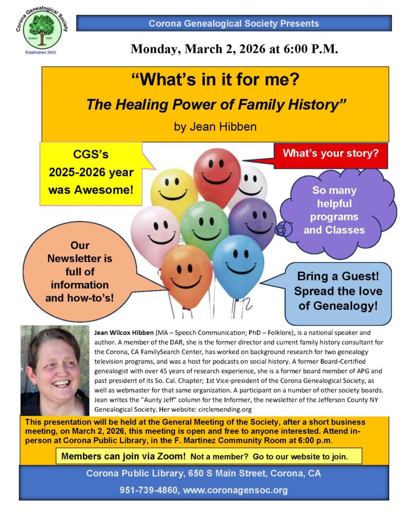 1st part of Annual Meeting – President’s report for the 2025-2026 season. Final draft will be posted to the Members Only page after the April meeting. Please consider bringing a guest, any questions you might have about past, present, and future programs and progress of the Corona Genealogical Society.